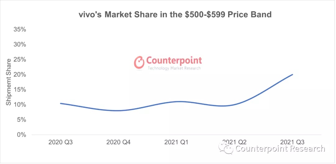 2021年Q3,vivo凭仗X系列的超卓体现,经过战略组合规划和途径继续演进的尽力下,在500-599美元的细分商场中占有抢先地位。