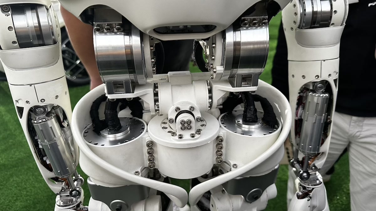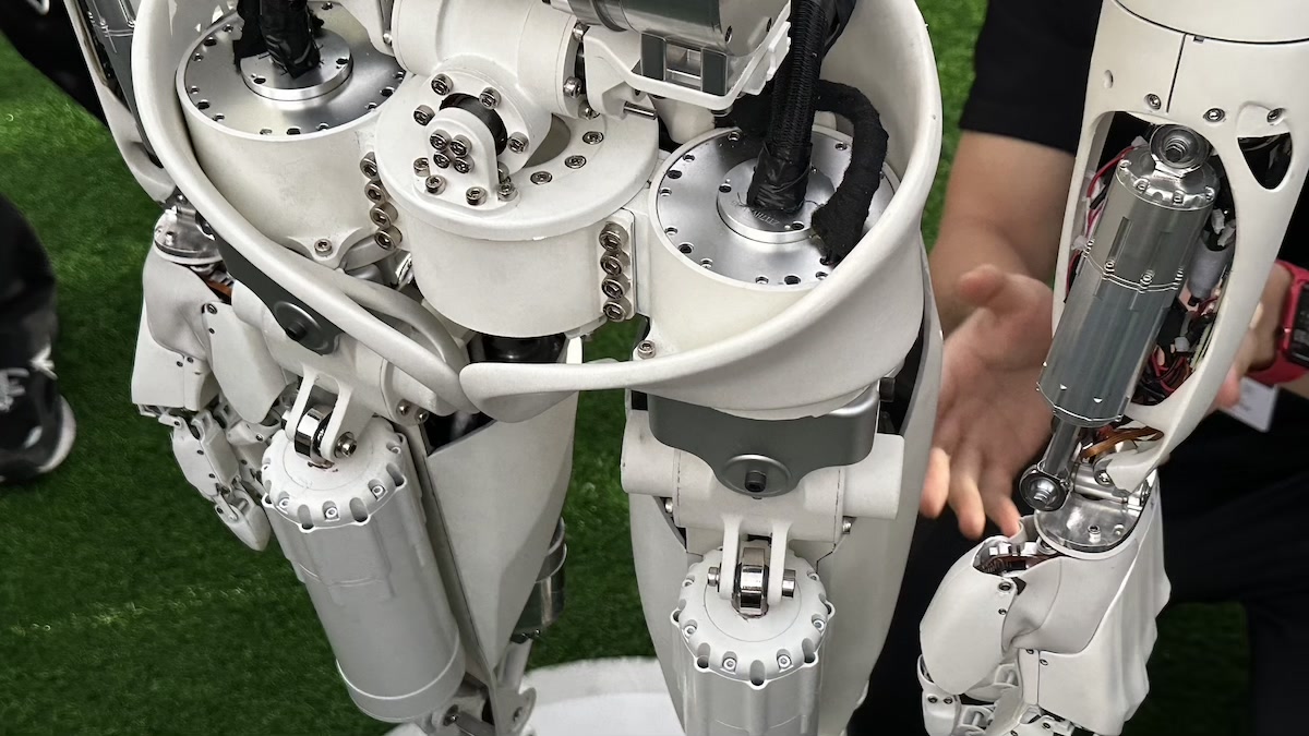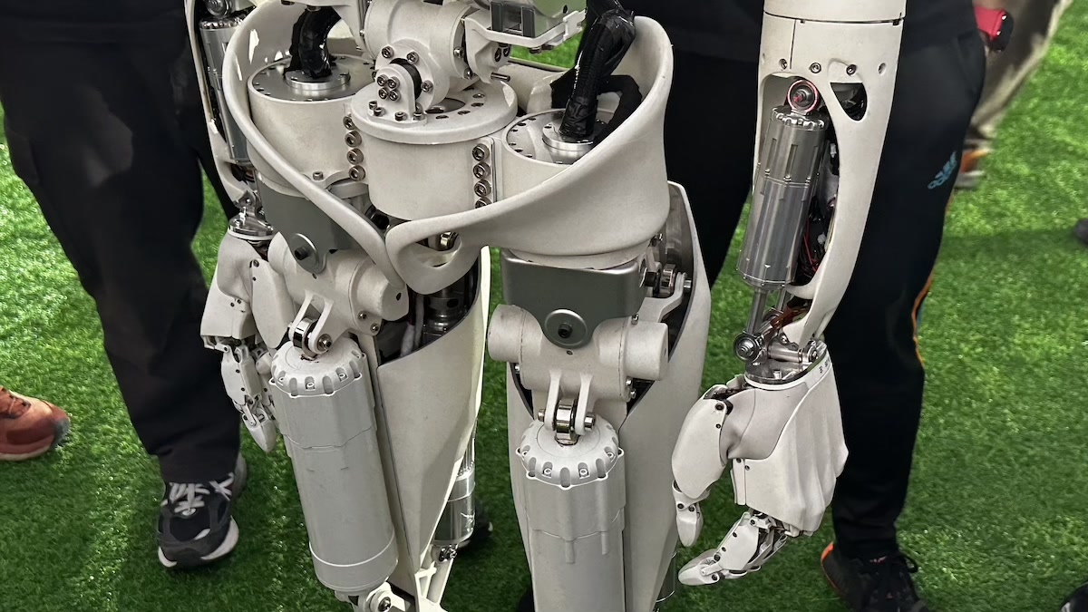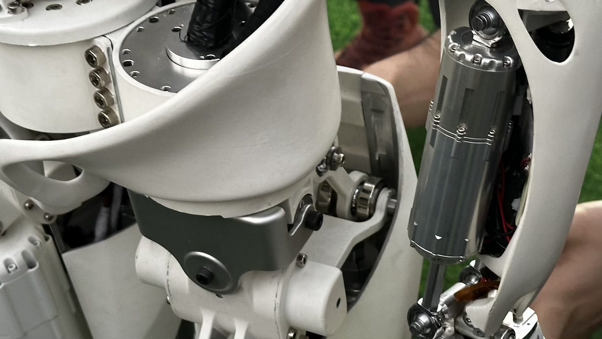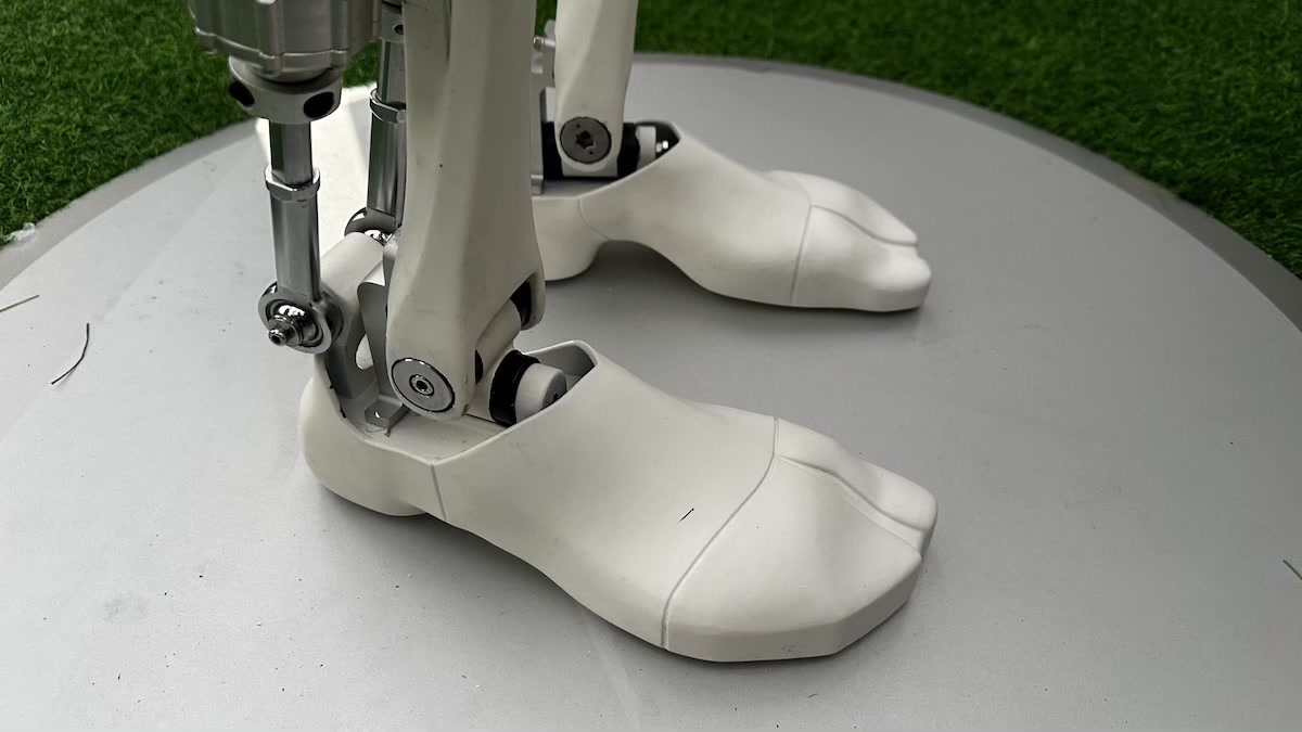 从脚的细节上来看,没有脚趾部分,但是有做出了足弓的规划,然后脚型很拟真。能够看到脚踝部分有关节,后部的跟腱部分则有电机担任拉伸。这样的关节规划,能够让机器人走路的时分更像真人,当然脚步的快慢怎么提高还需要后续的迭代。