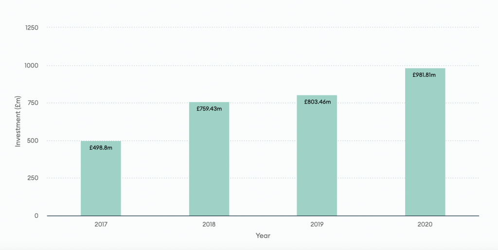 作为构思科技不断革新的重要推力,深科技范畴也在英国益发遭到重视。依据Tech Nation的数据显现,2020年期间,英国人工智能和机器学习类草创公司共取得4.78亿英镑出资,TMT及移动科技(Mobility Tech)类草创公司别离以4.37亿和2.85亿英镑排在这以后,这三类是构思科技范畴取得出资数量最高的类别。
