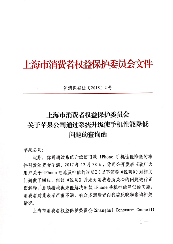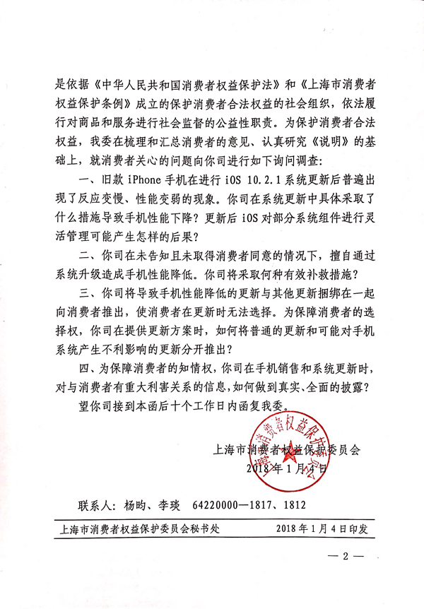 报导,上海市顾客权益维护委员会日前就这一事情宣布文件责问 Apple ,要求该公司在 1 月 19 日前给予答复。上海市消保委要求苹果答复以下问题: