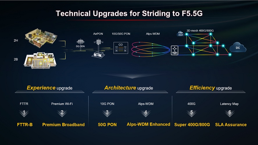 在UBBF 2023期间,华为光产品线副总裁金志国在绿色全光峰会上宣布了“F5.5G立异,点亮职业新增加”的主题讲演,并发布了迈向F5.5G的六大技能晋级,推进体会、架构、功率的全面进步,助力运营商在向F5.5G滑润演进的过程中加快商业正循环,并呼吁全工业一起推进F5.5G的老练与落地,逐渐完成万兆无处不在。